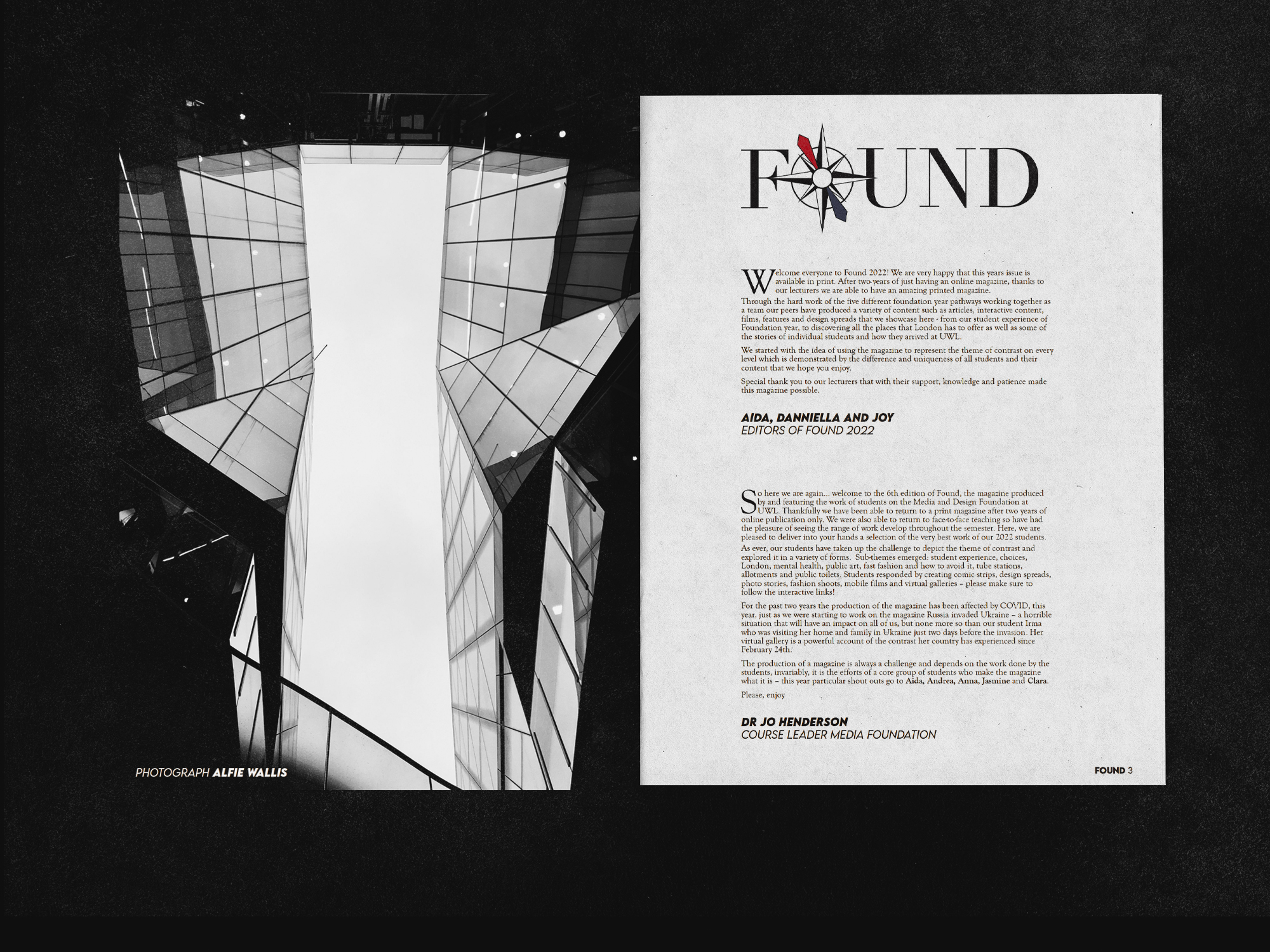 The Found magazine was a group project I participated in during my foundation year at the University of West London. In this project, graphic design students competed to have their logo selected, and my design was chosen as the official logo for Found. I also created the cover page for the magazine, which effectively conveys the concept of “being found,” using the year 2022 as a spotlight.